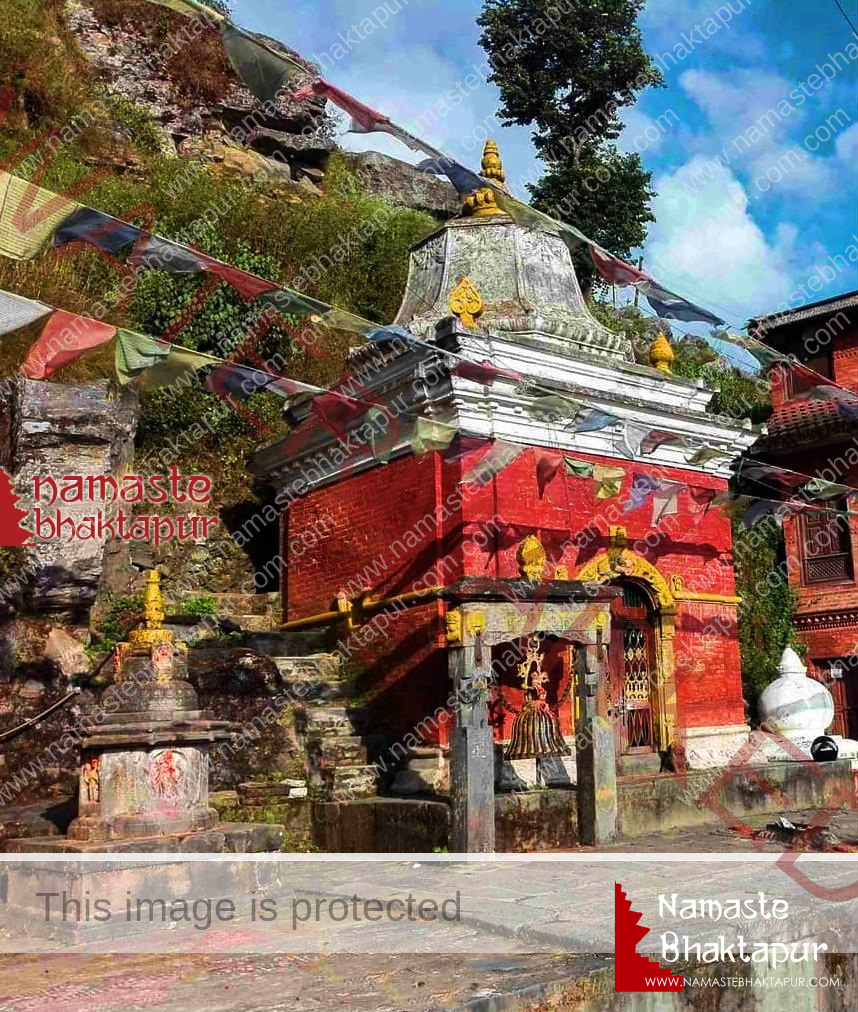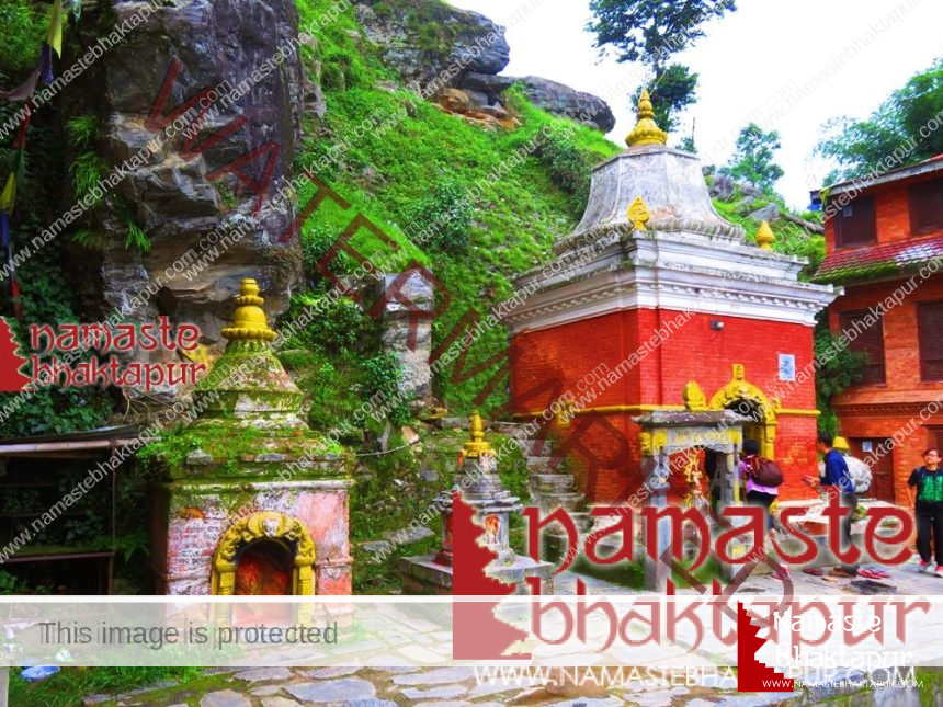 Maha Manjushree, according to mythology, appeared here before draining the water from the renowned Kathmandu Lake. Maha-mandap-Giri or Ratnagiri is the name of the hill. Several Buddhist sages and Siddhas are said to have visited the cave since it was revered as Maha Manjushree‘s grotto. Milarepa, a brilliant poet and Buddhist master who lived between the 11th and 12th centuries, was one of them. He is thought to have come to the valley on the invitation of a king from Kathmandu. The broken relics and the fallen boulder can still be discovered in the derbies, around 50 meters below the temple. Local Newars say Maha Manjushree arrived here before draining the famed Kathmandu Lake of water. Maha-mandap-Giri or Ratnagiri is the name of the hill.